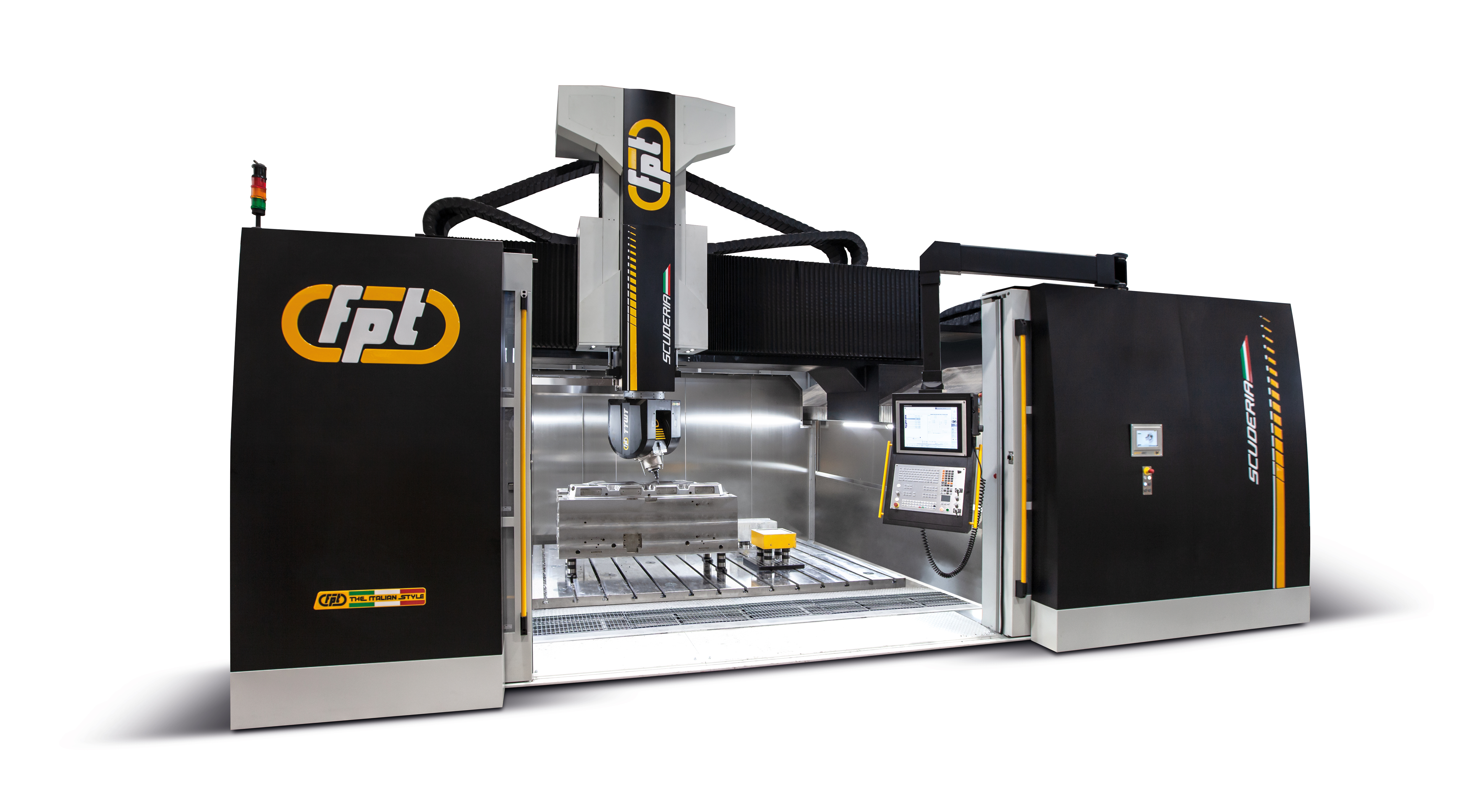 Scuderia is a state-of-the-art 5-axis vertical milling machine built to deliver absolute precision and performance in large-part machining. Its advanced gantry architecture and FEM-optimized cast-iron structures ensure maximum rigidity, while the integrated IAT – Intelligent Active Thermal control system eliminates thermal expansion errors by actively compensating for temperature variations during machining. Ideal For |